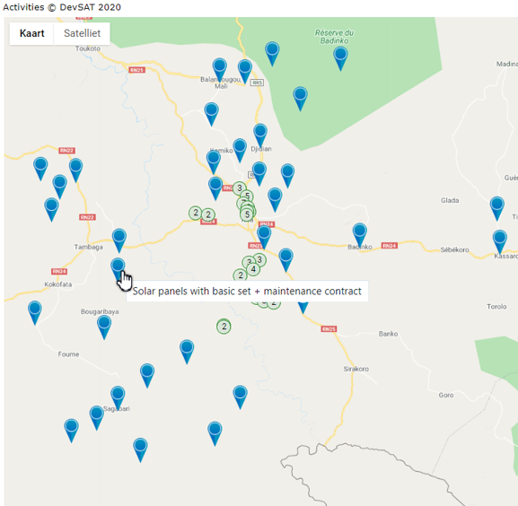 For the analyses, different dashboards exist. The user can filter activities on distinctions such as territory, project status, implementing organisation, funder, leading subject (i.e. OECD’s DAC list), and the items mentioned above. That allows us to obtain the shared basis for all actors: ‘who is doing what, where, when and how for whom’. DevSAT presents results in tables, charts, and thematic maps with distinctive markers (as illustrated here and in the book on Co-creating A&S and available reports in English and French).