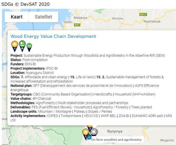 The details include National Development Plans, target groups, value chains (certified or not), target landscape units, methodologies (e.g. organic cultivation), needs to be able to increase their impact, and deliverables that other parties can use. These details are georeferenced, preferably to the lowest administrative unit (i.e. village).